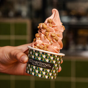 Strawberry cheesecake soft serve on a salted caramel crumble base.